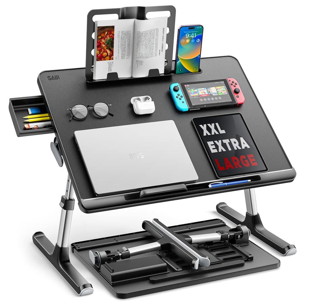 Marke: SAIJI Eigenschaften: Die Tischplatte ist aus hochwertigem Holz gefertigt und langlebig.. Die Beine sind aus Aluminiumlegierung gefertigt, was robust und stabil ist.. Die ABS-Handgelenkauflage und der Buchständer machen die Benutzung bequem und weniger ermüdend, selbst bei längeren Nutzungszeiten.. Zusammengeklappt ist es nur 5 cm dick, kompakt und kann unter einem Bett oder Sofa oder in den Zwischenräumen zwischen Möbeln verstaut werden, um Platz im Zimmer zu sparen.. Es wiegt nur 3,1 kg, wird mit einem Gurt geliefert und das leichte Design macht es Frauen leicht, es zu tragen und im Raum frei zu benutzen.. Es kann auch für Laptops bis zu 17 Zoll verwendet werden.. Der freie Platz kann zum Abstellen von Smartphones, Notizblöcken und Schreibutensilien genutzt werden.. Im normalen Leben ist es ein großartiger Klapptisch zum Essen, Studieren, für das Homeoffice und andere Arbeiten.. Die Beinenden sind mit ABS-Schutzkappen ausgestattet, die stabil und rutschfest sind, um Kratzer auf dem Boden zu verhindern.. Zusätzlich sind die vier Ecken des Bretts mit flexiblem und glattem Silikagel eingefasst, um Ihre Hände vor Kratzern zu schützen, die Sicherheit zu erhöhen und können auch in Haushalten mit Kindern sicher verwendet werden.. Es wird mit einem Buchständer geliefert, sodass Sie ihn in die Rille einsetzen und verwenden können, oder Sie können den Buchständer einfach entfernen.
