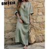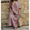 GMXIA S-5XL Damen Frühling Sommer Kleidung Übergröße Damen Baumwolle Leinen Locker Gestreift Langes Kleid mit Taschen