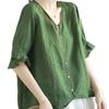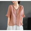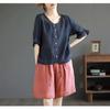 Baumwolle und Leinen Literarisch Retro Fünf-Punkt-Ärmel Baumwolle Leinen V-Ausschnitt T-Shirt für Damen Locker Schlank und Vielseitig Besticktes Oberteil