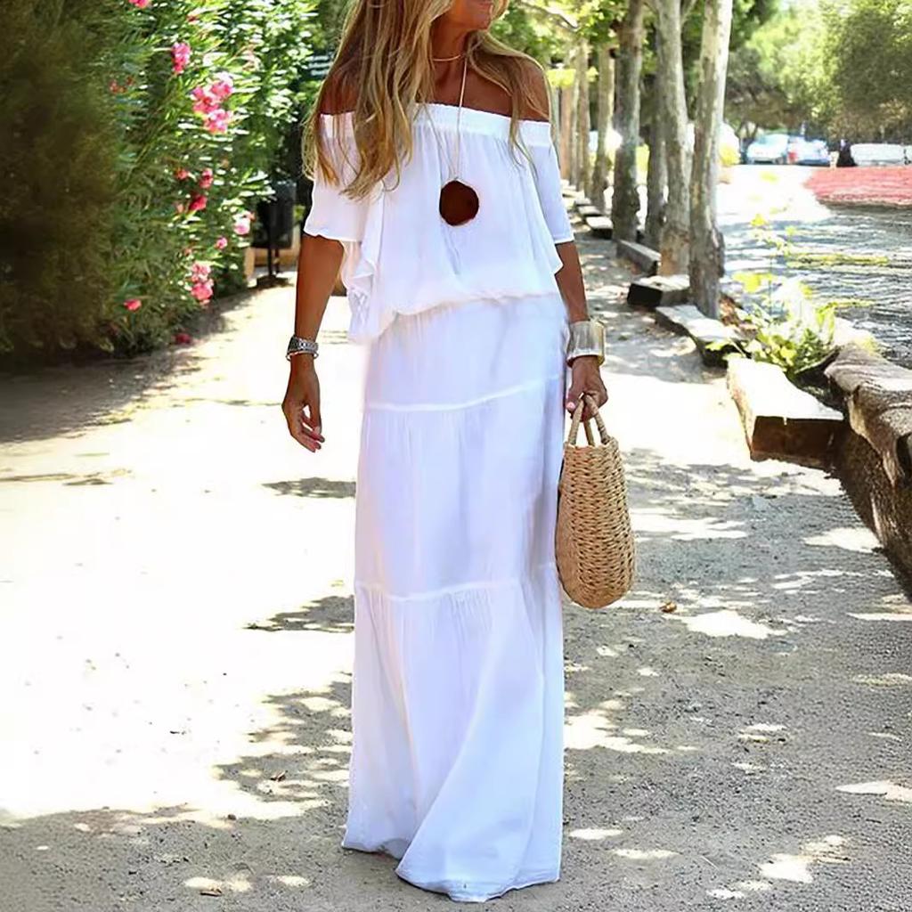 Damen einfarbiges kurzärmeliges schulterfreies lässiges langes Kleid
