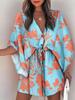 Damen Sommer Mini Kleid Locker V-Ausschnitt Schnürung Fledermausärmel Print Strandparty Knopfkleid