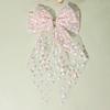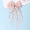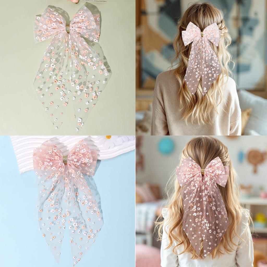 Featuring a large bow and long tail, this hair clip adds a touch of elegance to any outfit with its pink floral print.