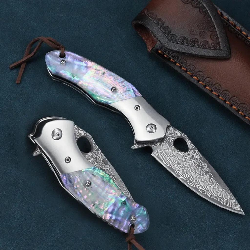1 piece of high quality Damascus steel pattern folding knife, manual rotating small knife, family fruit knife.