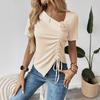 Ein neues, minimalistisches Damenoberteil mit Kordelzug, dreidimensionalen Blumen, unregelmäßigem V-Ausschnitt, kurzen Ärmeln und einfarbig.
