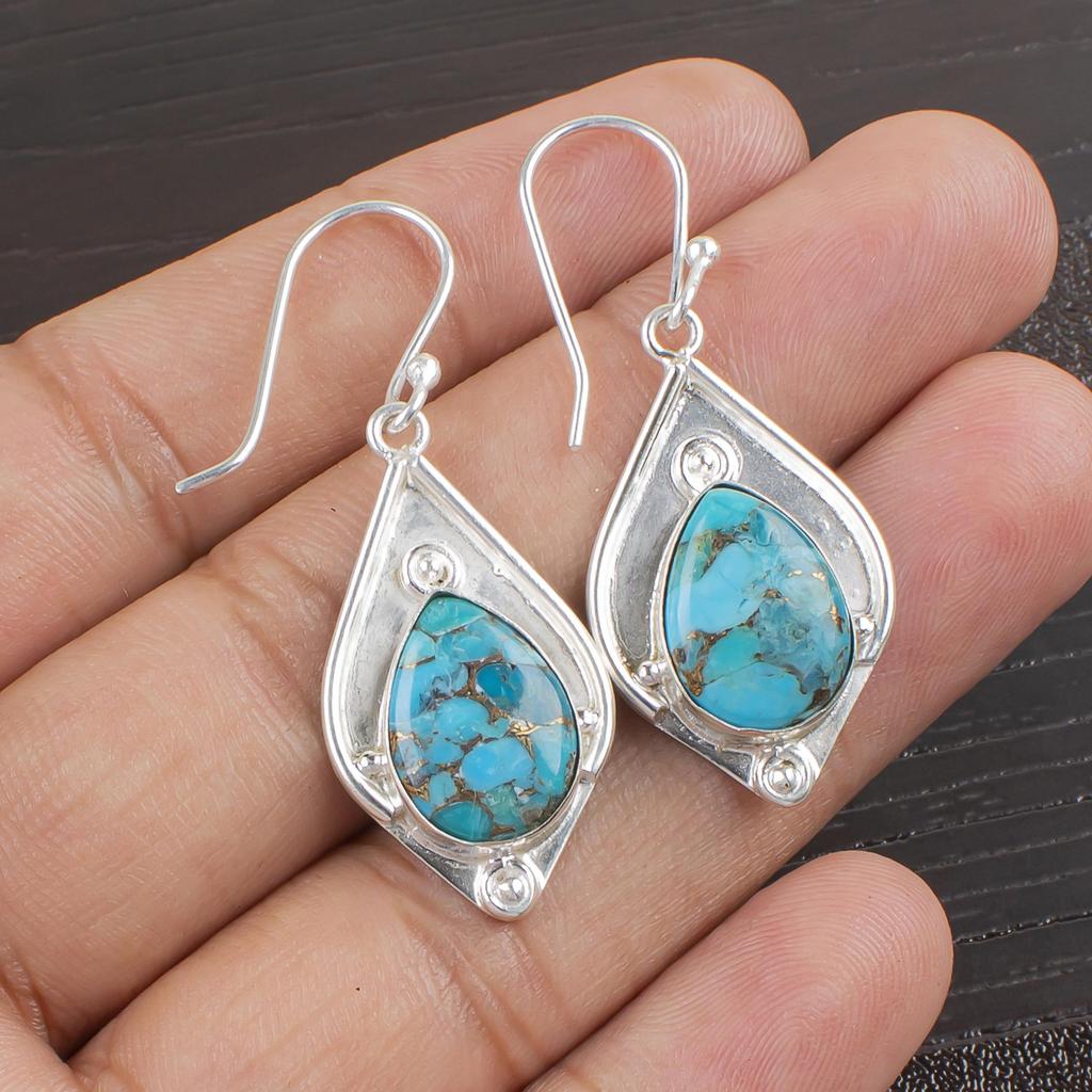 Blaue Kupfer Türkis Handgemachte Edelstein Ohrringe, 925 Sterling Silber Ohrringe Antiker Schmuck, Für Verlobungsgeschenk