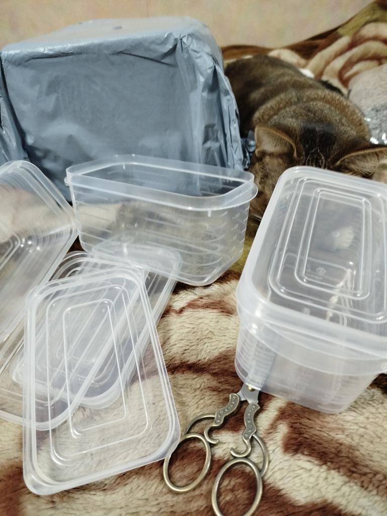 Fünf Behälter mit Deckeln. Sehr praktisch für die Lagerung im Gefrierschrank.