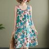 Echter Sommer neue Baumwolle und Leinen große Größe literarisch locker ärmellos Rundhals Druck Hosenträger A-Linien-Kleid Frauen