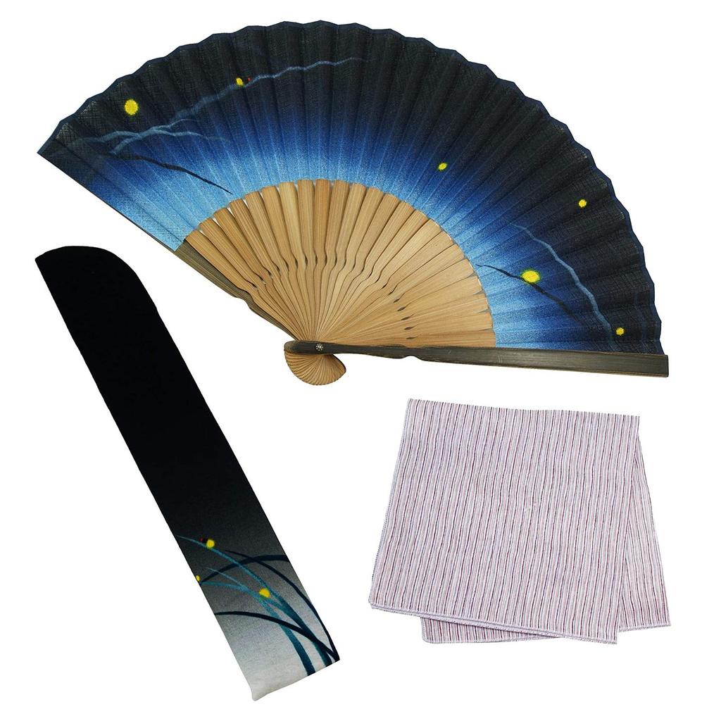 Material: Fan surface: 100% cotton, Fan ribs: bamboo, Fan case: 100% cotton, Handkerchief: 100% cotton (Made in Japan)