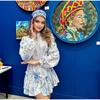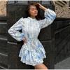 Damen Bedrucktes Stehkragen Puffärmel Langarm Rüschenkante Kurzer Rock Lässiges Slim Fit Kleid Blauer Druck Sommer Neue Kollektion Taillenkleid