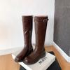 Gewaschenes Rindsleder Herbst und Winter dünne hohe Stiefel Gürtelschnalle Damen dicker Absatz dicksohlige lange Reiterstiefel