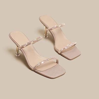 Sommer neue Strass Ein-Wort mit hohem Absatz Halbschlepp Damen Sandalen hohe Absätze dünner Absatz transparent hohe Absätze Pantoletten