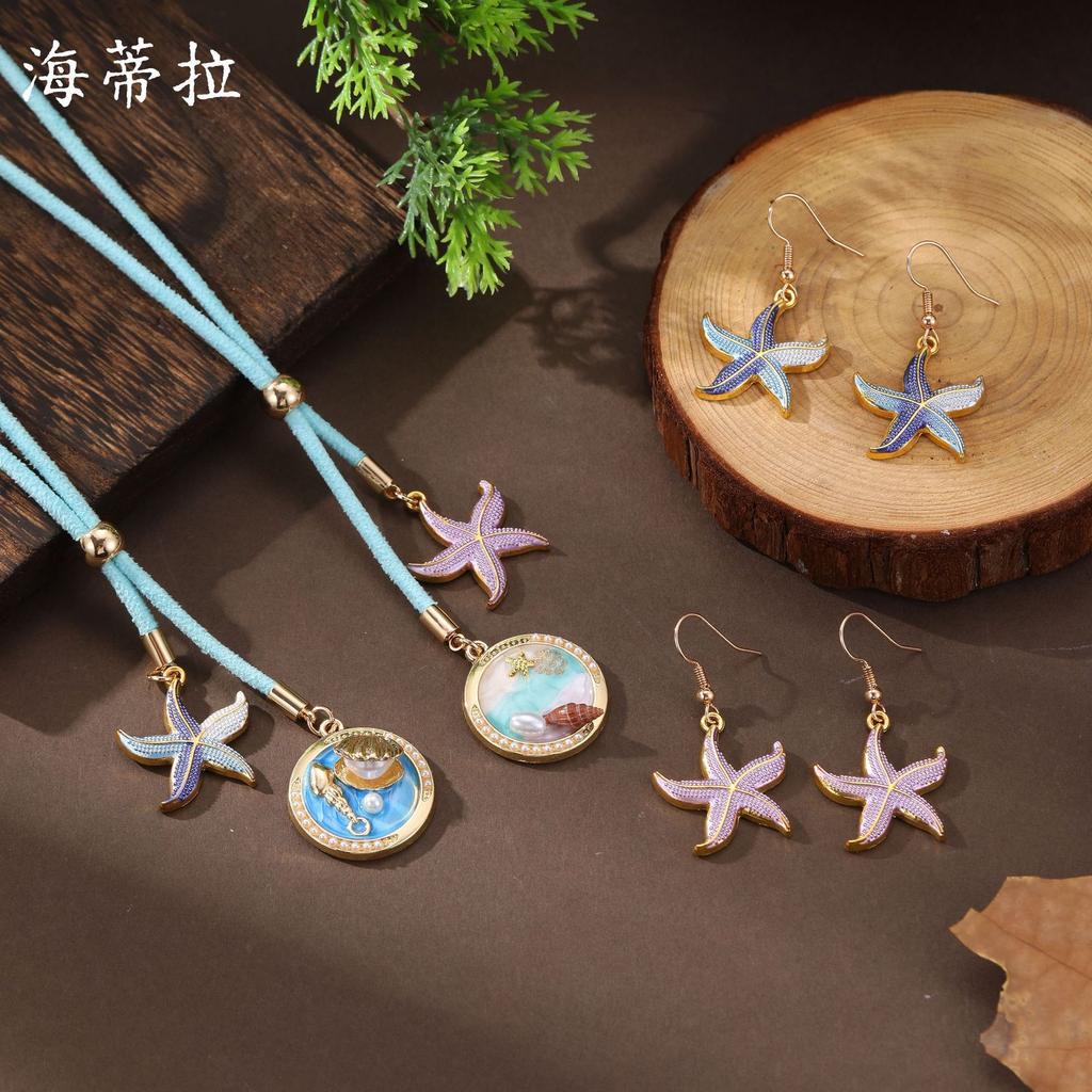 Neue Emaille Farbe Seestern Muschel Ohrringe Lange Halskette Damen Sommer Strand Klein Klar Seestern Langer Anhänger