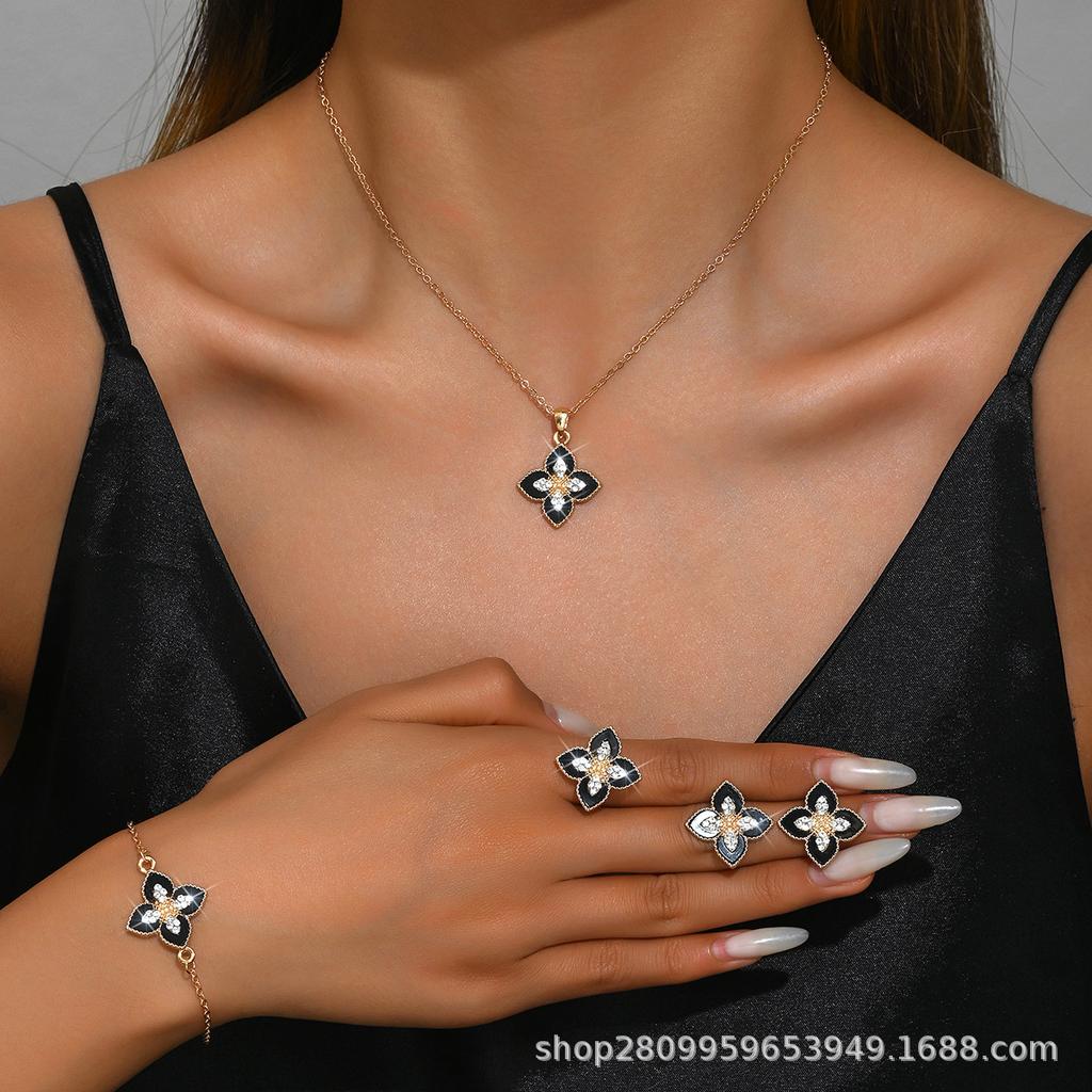 Neues Glücksklee Halskette Ohrringe Armband Ring Set, Vierblättrige Blume Damenschmuck 128