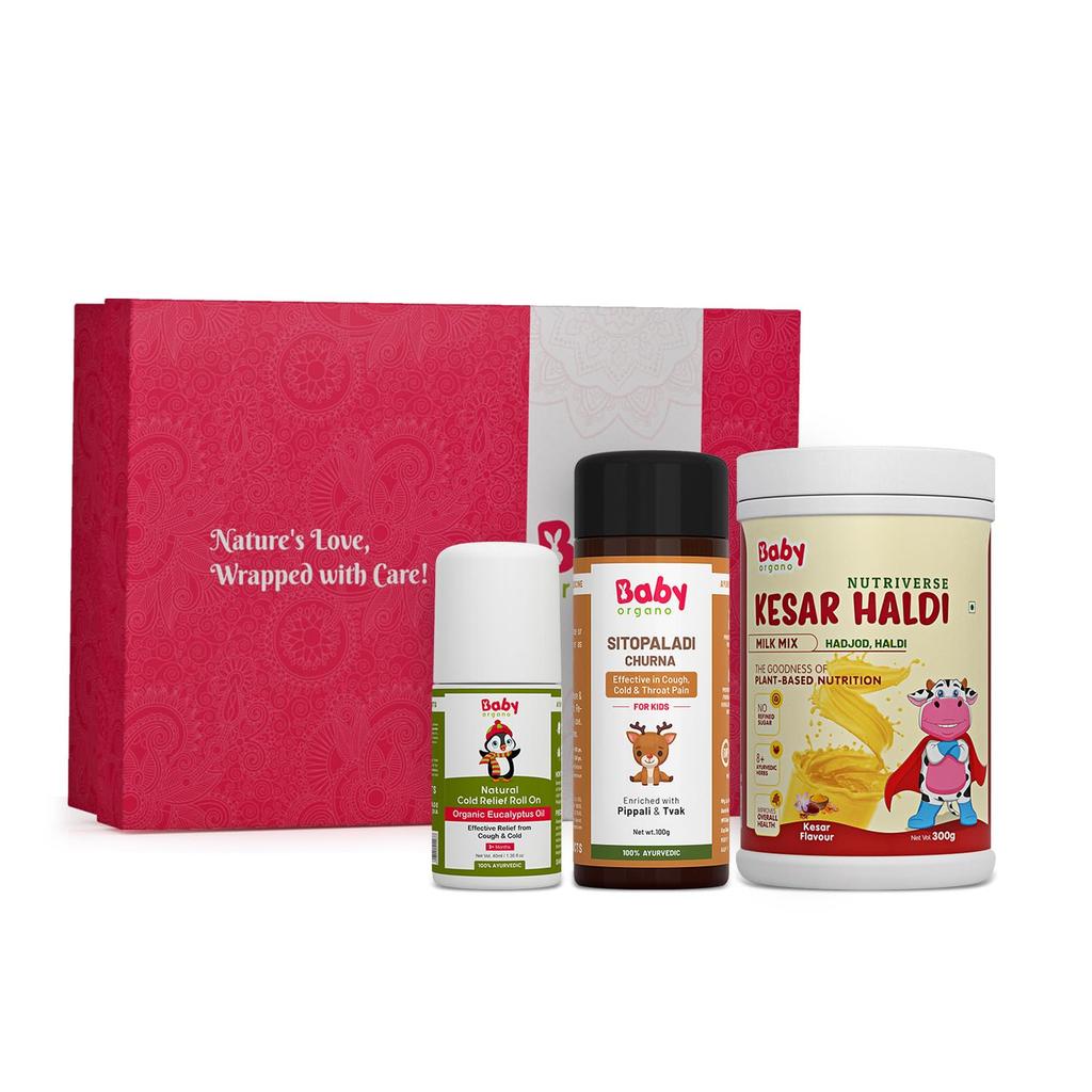 BabyOrgano Geschenkset - Sanfte Pflege Erkältungslinderung | Kesar Haldi Milchmischung - 300g | Erkältungslinderungs-Roll-On - 40ml | Sitopladi Churna - 100g