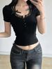 Neckholder-Spitzenbesatz, Schleife, süßes schwarzes Y2K-T-Shirt für Damen mit Knopfleiste, schmale Kurzarm-T-Shirts in Weiß, süße Balletcore-Kleidung