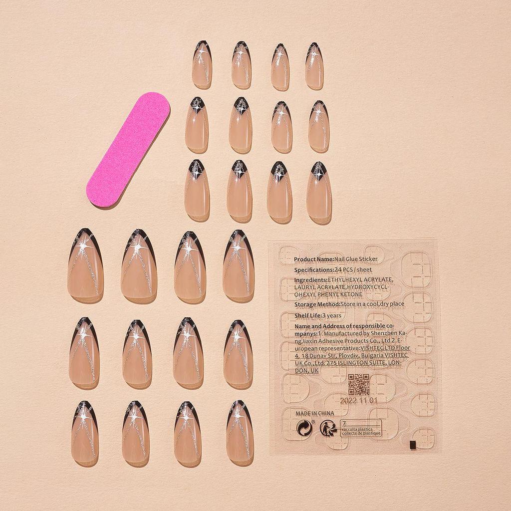 Almond-Shaped Wearable French Nails: Gold Lines & Stars Design