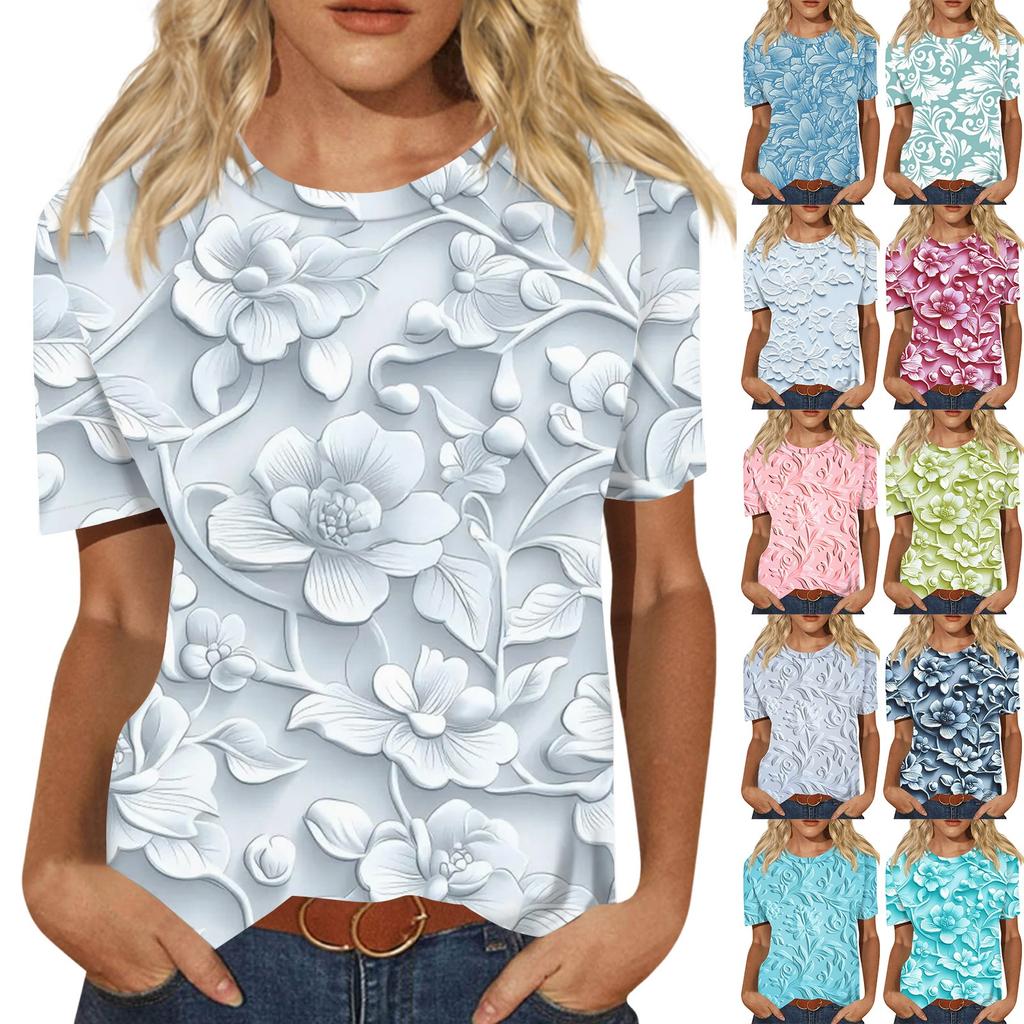 Damen Freizeit 3D Blumendruck Freizeit Kurzarm T-Shirt Pullover Rundhals Kurzarm Oberteil