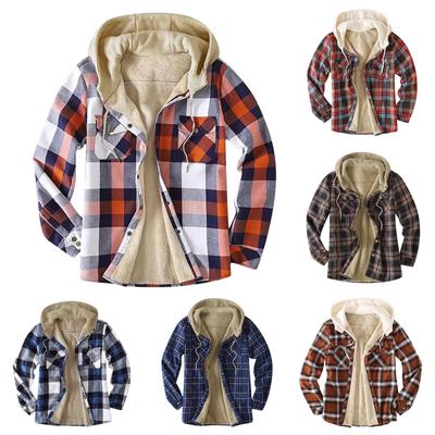 Gestepptes, gefüttertes, kariertes Button-Down-Hemd für Herren. Mit Samt versehen, um warm zu bleiben. Jacke mit Kapuze(Nicht positionierendes Drucken)