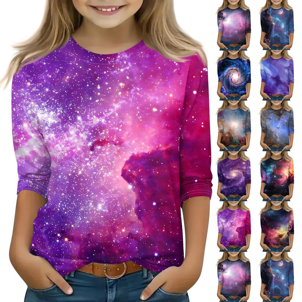 Bedruckte Oberteile für junge Mädchen von 5–16 Jahren, Rundhalsausschnitt, 3/4-Ärmel, T-Shirts, trendige Oberteile, Outfit-T-Shirts