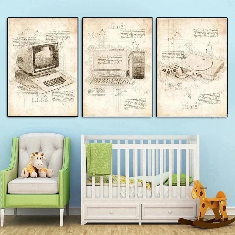 Retro Kunst Von Da Vinci Inspirierte Skizzen Poster Gitarre Vitruvianischer Mann Taschenuhr Spielekonsole Leinwandmalerei Bilder Heimdekor