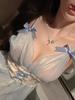 Fresh deep V sky blue lace suspender sexy hollow big bow pearlescent jumpsuit