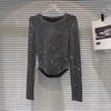 Werten Sie Ihre Herbstgarderobe mit diesem stilvollen Übergrößen-T-Shirt auf, das sowohl auf Komfort als auch auf Flair ausgelegt ist.. Dieses Oberteil hat einen einzigartigen geschwungenen Saum und ist aus hochwertiger Baumwolle gefertigt, was eine weiche und atmungsaktive Passform gewährleistet.. Die langen Ärmel bieten Wärme für kühlere Tage, während der runde Ausschnitt eine klassische Note verleiht.. Dieses T-Shirt, verziert mit Strassdetails, vereint mühelos lässige Eleganz mit einem Hauch von Glanz und macht es perfekt für Tag- und Abendkleidung.