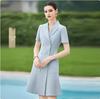 Elevate your workwear with this elegant and slimming summer dress, designed to make a statement in any professional setting. Featuring a double-breasted design and a sophisticated suit collar, this dress combines style with functionality. The short sleeves offer a breezy feel, perfect for warm weather. Crafted from high-quality viscose fiber, it ensures a comfortable fit while providing a flattering silhouette. Whether you're heading to the office or a formal meeting, this dress is an ideal choice for modern and confident women.