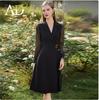 Spring Black Mesh Sleeve Goddess Dress - Waist-Slimming Suit Collar, Mid-Length Professional Women's Outfit