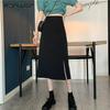 Women's High-Waist Black Midi Skirt - Drape Design with Slit, A-Line, Over-the-Knee, Perfect for Spring/Summer