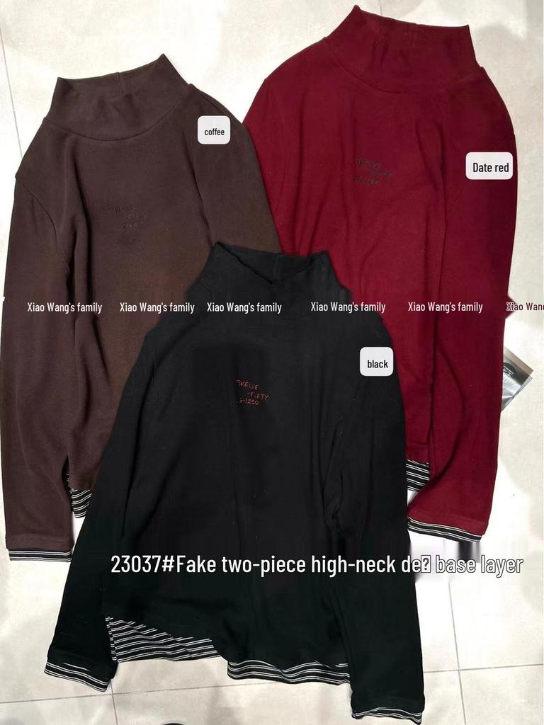 Xiao Wang's Winter Korean Loose Fit Plus Size High Neck Letter Faux Two-Piece T-Shirt