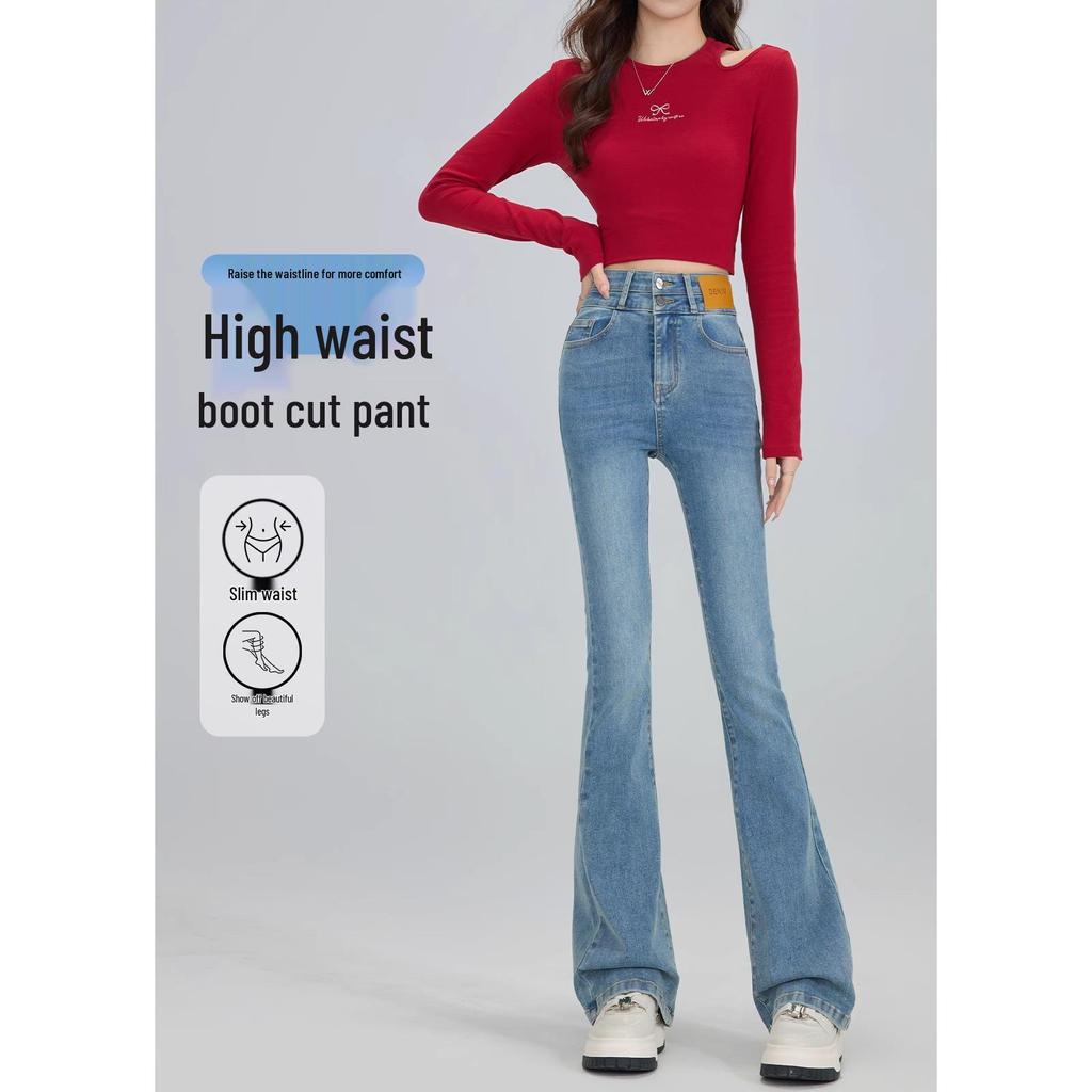 Crafted from premium denim, these stylish jeans feature a high waistline and a unique horseshoe flare cut, channeling a vintage vibe with a modern twist. Perfect for those who appreciate a sportive look, these jeans offer both comfort and fashion-forward design. The enduring denim material ensures durability, making them a versatile addition to any wardrobe for the spring season.
