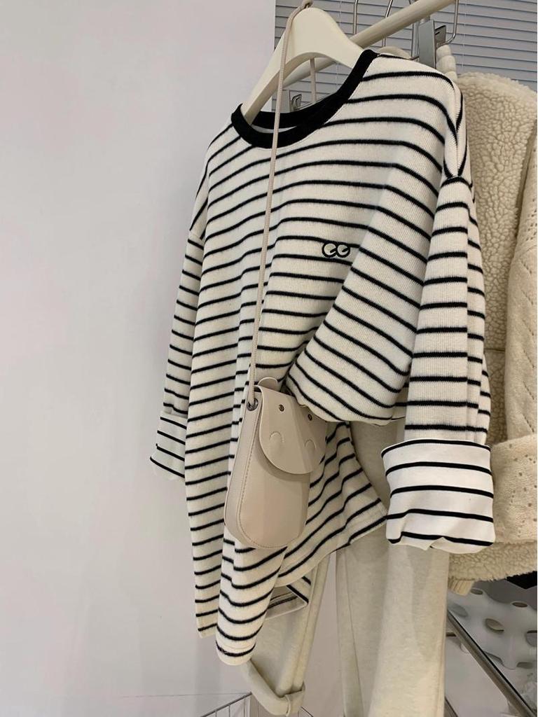 2218 Embroidered Brushed Striped Mid-Length T-Shirt - Early Spring 2023 Edition for Women