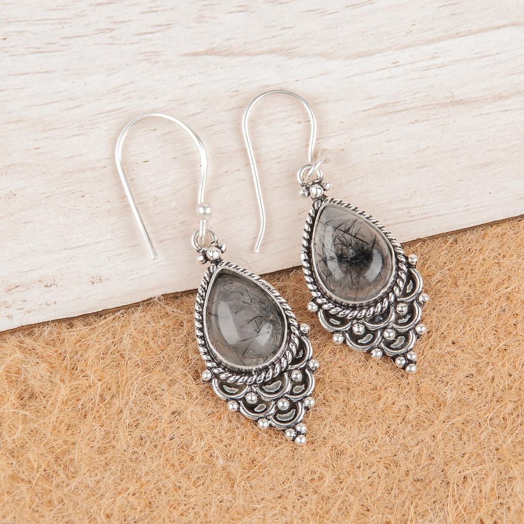 Natürlicher Schwarzer Rutil Edelstein 925 Sterlingsilber Schmuck Handgefertigte Ohrringe 1.9" EE-85-23