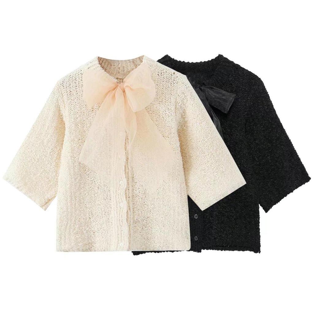 Spring 2025 Sweet Bow Brooch Transparent Knit Top for Women
