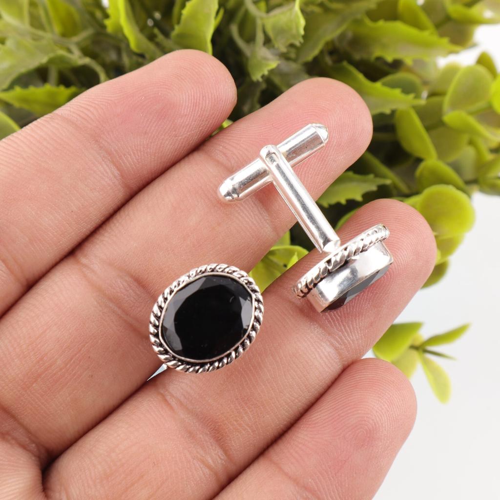 Natürlicher Schwarzer Onyx Edelstein 925 Sterling Silber Handgefertigter Schmuck Manschettenknöpfe 0.6" CL-1-18
