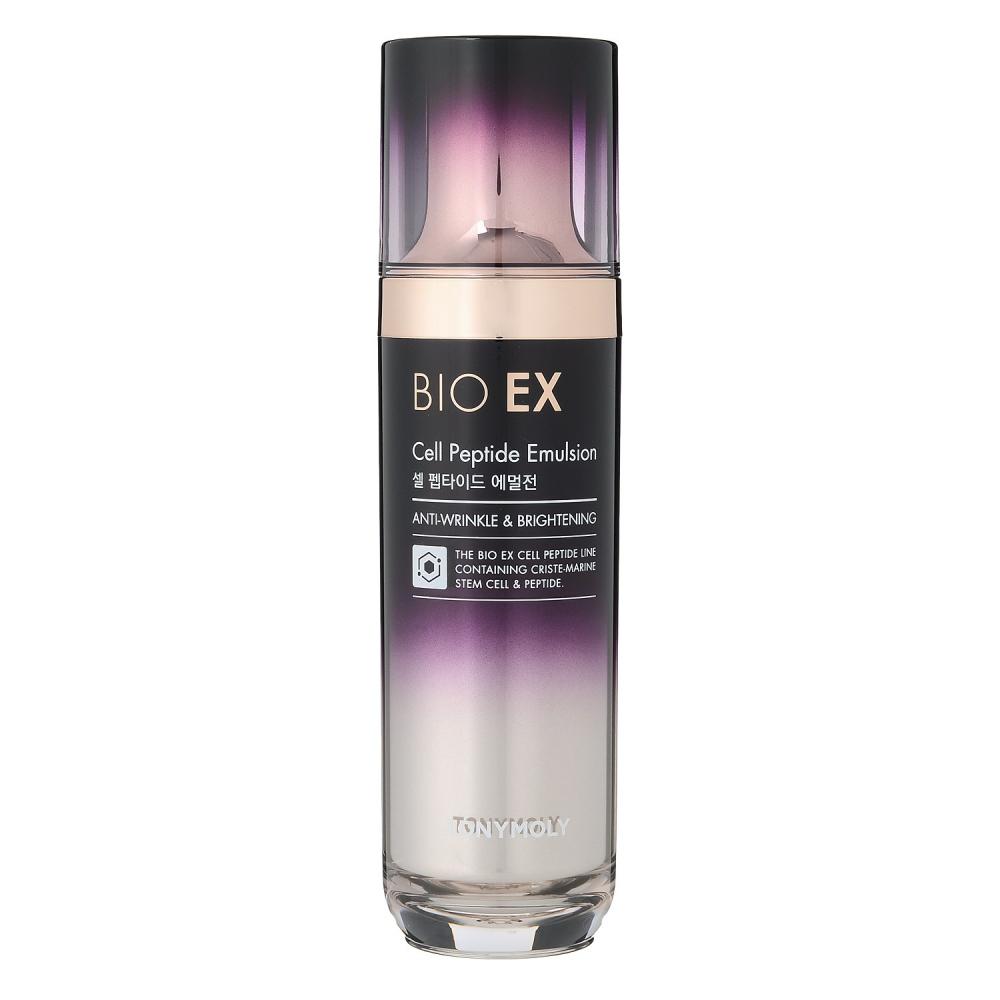 TONYMOLY's Bio EX Cell Peptide Emulsion is a dual-function cosmetic designed to improve wrinkles and whiten skin, providing nourishment and vitality to the skin. This product contains Crista Marine stem cells and botulinum-derived peptides, which help improve skin elasticity and reduce wrinkles. Additionally, it includes 93% to 96% biomimetic water to deliver ample moisture and nutrition, keeping the skin bright and firm.