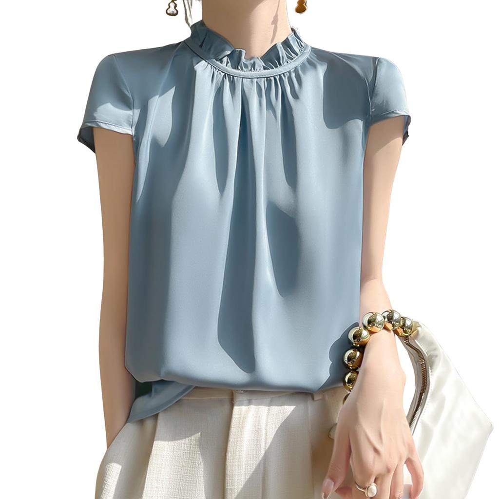Blusen für Schlicht Kurz Steh Rüschen Groß Büro Schnitt und Rund Pendeln [Augseed] Damen, T-Shirts, Sommer, Ärmel, Kragen, Oberteile, Stilvoll, Hals,