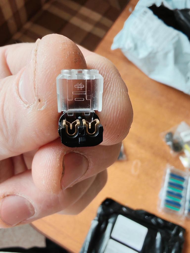 Die Klemmen für Drähte sind eingegangen. Ich denke, es wird bequem sein, Drähte ohne die Verwendung von Isolierband zu verbinden.