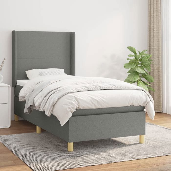 Utilisez ce lit à sommier pour profiter d'une nuit de sommeil réparatrice ! Il vous offre une relaxation maximale et un sommeil agréable. Tissu durable : le tissu présente un aspect simple et épuré, et il est respirant et durable. Matelas à ressorts ensachés : le ressort ensaché individuel intégré est connu pour sa très haute qualité tout en assurant un haut niveau de durabilité et d'adaptabilité. Il peut absorber efficacement le bruit et les chocs causés par les sauts et les rotations. Support moyen-dur : ce matelas de lit offre une stabilité accrue et juste le niveau de fermeté sans sacrifier le confort. Il est donc idéal pour les personnes qui dorment sur le dos ou sur le ventre. Protège-matelas doux pour la peau : le protège-matelas est recouvert d'un tissu résistant et doux pour la peau, ce qui le rend souple et confortable. Remarque : Pour des raisons d'hygiène, le matelas ne peut pas être retourné si l'emballage est retiré ou ouvert. Chaque produit est livré avec un manuel de montage dans la boîte pour un montage facile. Lit : Couleur : gris foncé. Matériaux : tissu (100% polyester), bois de mélèze massif, contreplaqué, bois d'ingénierie. Dimensions : 193 x 93 x 118/128 cm (L x l x H). Matelas de lit : Couleur : blanc et gris foncé. Matériau : tissu (100 % polyester). Matériau de remplissage : ressorts ensachés, mousse. Dimensions : 90 x 190 x 20 cm (l x L x H). Surmatelas de lit : Couleur : blanc. Matériau du sur-matelas : tissu (100 % polyester). Matériau de remplissage : mousse. Dimensions : 90 x 190 x 5 cm (l x L x H). La livraison contient : 1 x cadre de lit. 1 x tête de lit avec oreilles. 1 x matelas. 1 x surmatelas. Pays de livraison : uniquement la France métropolitaine (hors Corse et TOM).