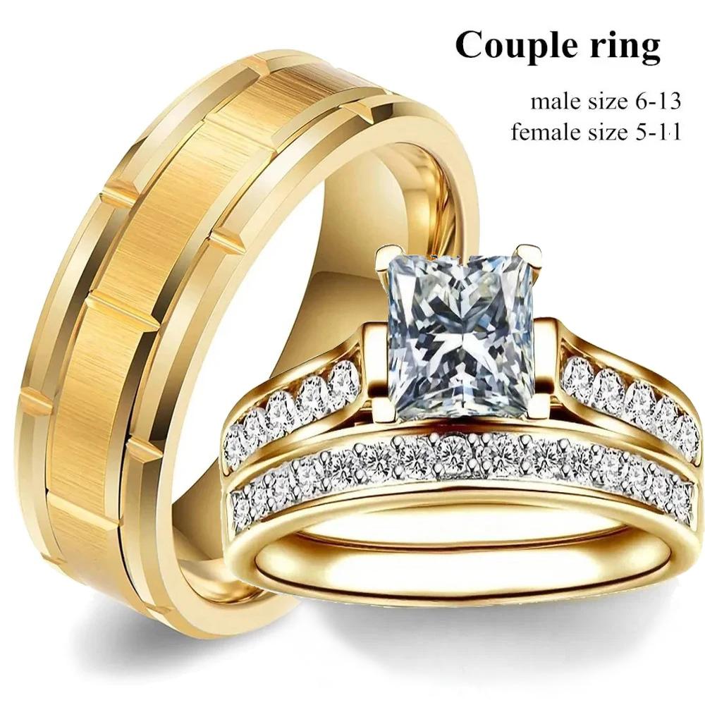 Modische Partnerringe Luxus Goldfarbe Damen Strass Zirkon Ringe Set Schlichter Herren Edelstahlring Hochzeitsschmuck Geschenke