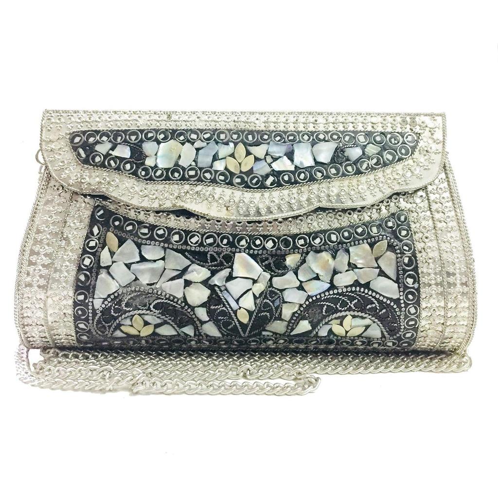 Damen Silber Muschel Perlmuttstein Ethnische Clutch - Indische Antik Mosaik Metall Party Geldbörse