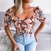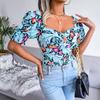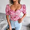 Damen Sexy Rückenfrei Quadratischer Kragen Floral Chiffon Bluse Top Laterne Kurze Ärmel Hemd Frühling Sommer Rot Blau Schwarz S M L XL