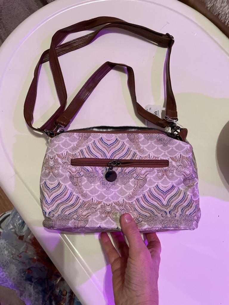 Die Handtasche ist hübsch, hat drei große Reißverschlussfächer, zwei an den Seiten, zwei Riemen, alles sehr praktisch.