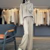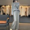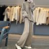 Damen 100% Wolle Strick Zweiteiler: Rundhals-Cardigan & Weitbeinige Hose