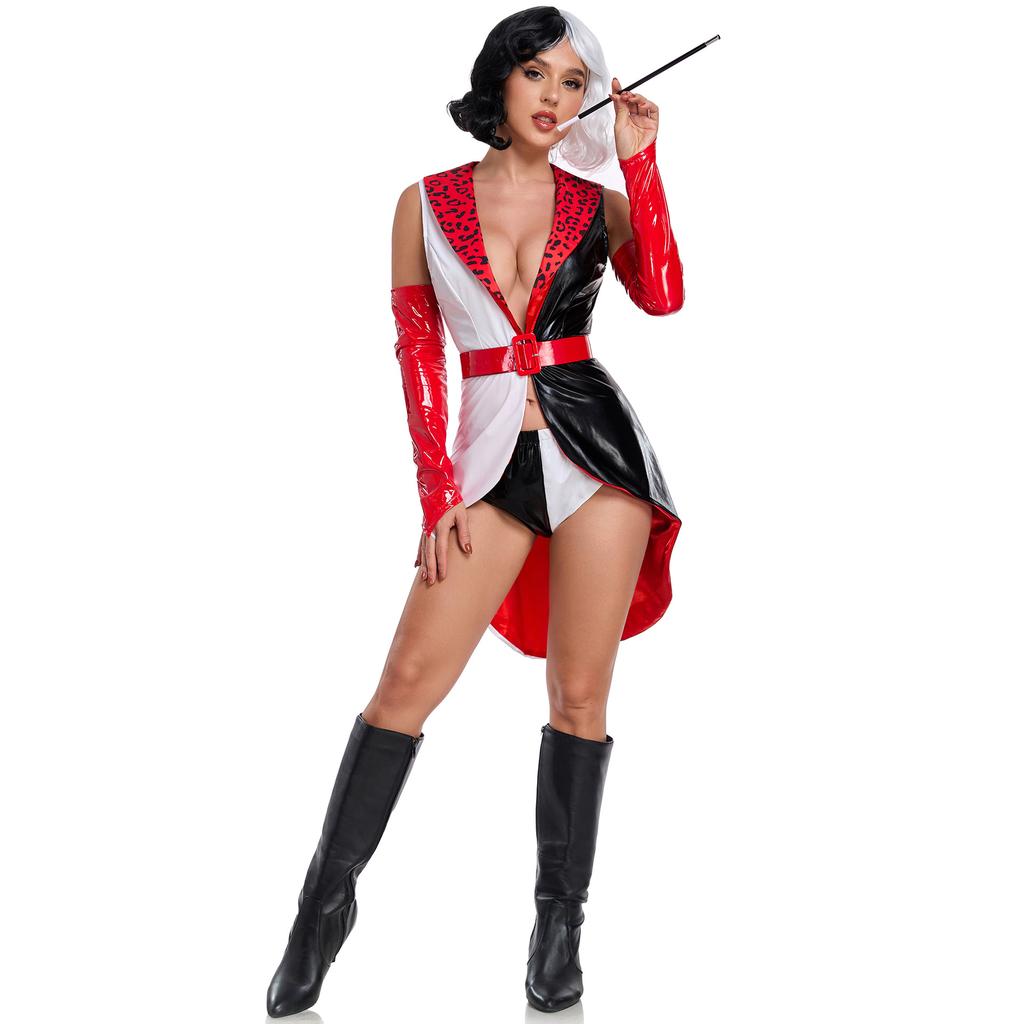 Neues Kuila Cosplay-Kostüm, Lackleder sexy schwarz-weiß Hexe Dalmatiner Cruea Halloween-Kostüm