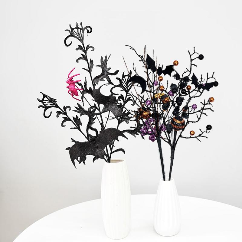 Enhance your Halloween decor with this spooky Artificial Flower. Featuring a bat and moon design with black leaves, this high-quality and durable decoration is perfect for creating a festive atmosphere during festival.