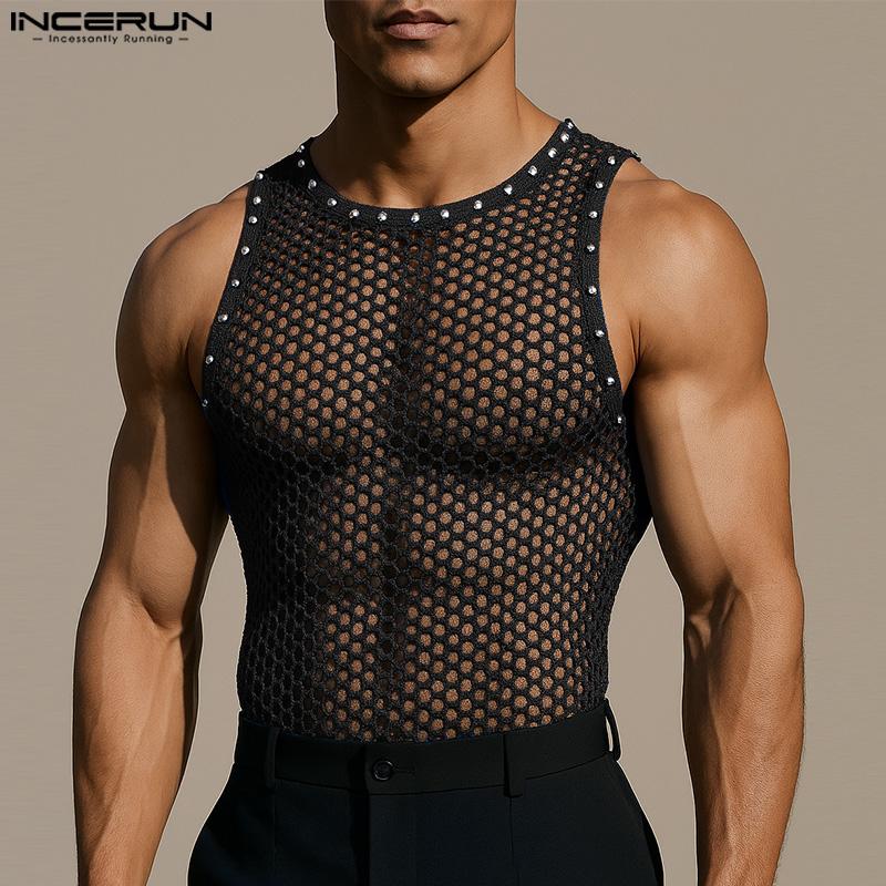 INCERUN Herren Ärmellos Durchsichtig Nieten Patchwork Lässige Tanktops