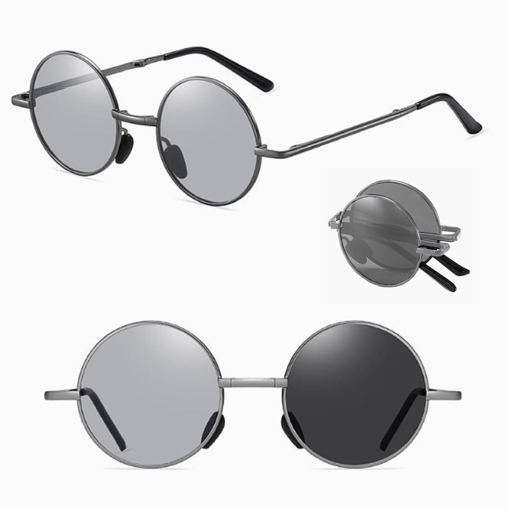Polarisierte photochrome farbwechselnde Falt-Sonnenbrille Runde Gläser UV-Schutz Klassische runde Gläser 2 [REONAS] + (Gunmetallic)