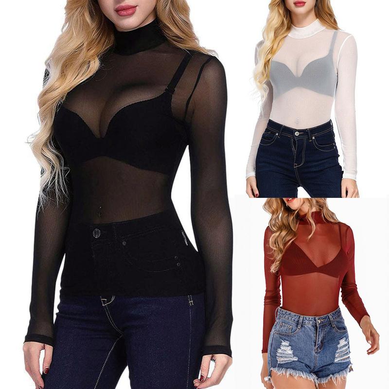 Damen Mesh Oberteil Durchsichtig Ultradünn Sexy Stretch Langarm Oberteil