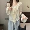 Französisches Designer-Nischen-Chiffon-Bluse Damen V-Ausschnitt Langarm Sonnenschutz-Cardigan Rüschenoberteil Sommer Dünner Stil